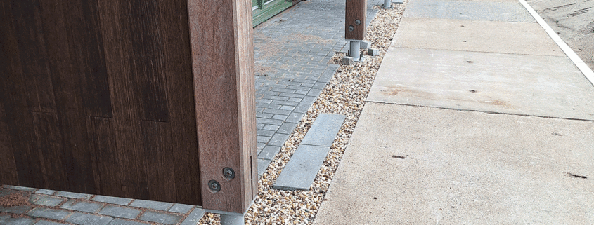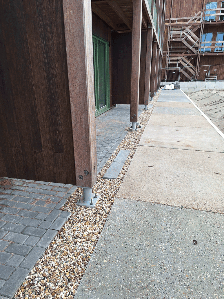 De drie door ons ontworpen binnentuinen voor de Flexwoningen op strandeiland worden aangelegd. De aannemer heeft een strook aangelegd welke we beoordeeld hebben. Er worden tweede hands stelconplaten toegepast met betonklinkers en stoere betonnen keerwanden. De reststroken worden gevuld met grind. Hierin zijn stapstenen opgenomen zodat ze prettig beloopbaar zijn.