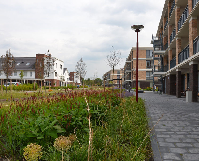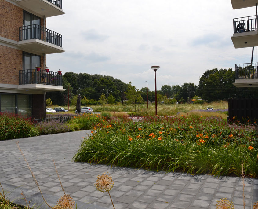 De parkwoningen zijn ontworpen met een verhoogd terras als onderdeel van de woning. Wij hebben gekozen voor grote heestergroepen van deels wintergroene heesters om te zorgen voor de inpassing en de privacy van de terrassen. De heestergroepen dragen bij aan het natuurlijke karakter van het park. De groepen zorgen voor verblijfplaatsen van allerlei vogels, zoogdieren en insecten. Tevens zorgt het voor beschutting van de terrassen en krijgt het park meer ruimtelijkheid.Voor de openbare ruimte van de wijk Blokhoeve Oost hebben we gekozen voor een driedeling. De parkeerzone met grote bomen in een grid refererend aan de populieren aanplant in de omgeving, een grote vaste planten border om de drie grote appartementencomplexen een zone van gras met fruitbomen met hierin opgenomen de speelgebieden tussen de rijwoningen.