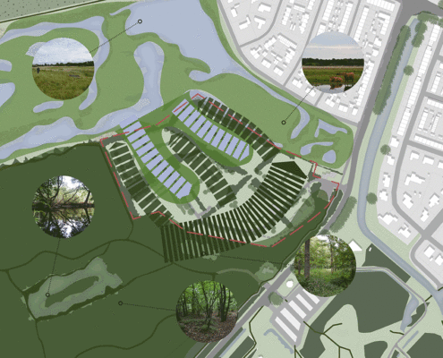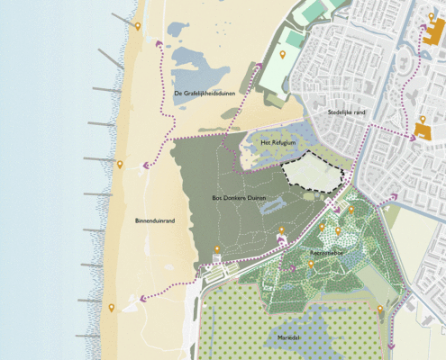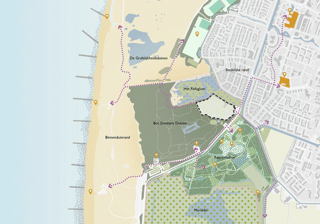 Het project Donkere Duinen in Den Helder omvat de transformatie van de voormalige camping Donkere Duinen tot een kleinschalig vakantiewoningenpark. Het terrein ligt direct tegen de duinen, het natuurgebied het Refugium – ingericht als natte duinvallei – en de wijk Duinbuurt. De huidige parkachtige camping maakt plaats voor een bosachtig gebied met twee opener ingerichte natte duinvalleien. Zo krijgt het terrein een sterke ecologische meerwaarde en sluit het beter aan op de bestaande natuurlijke kwaliteiten.
