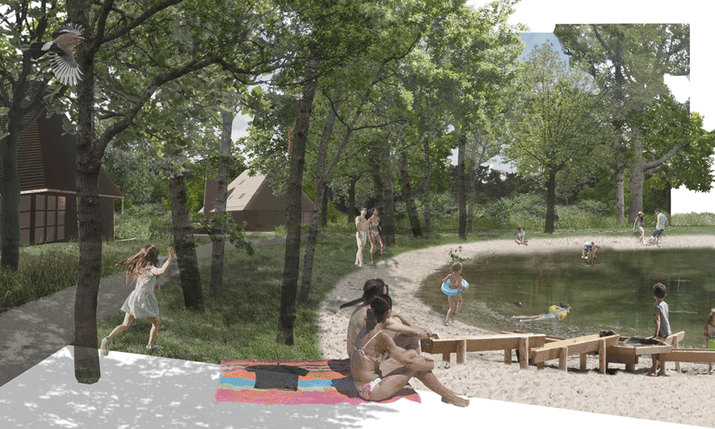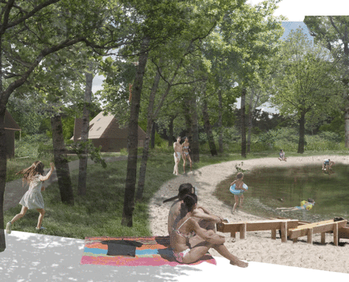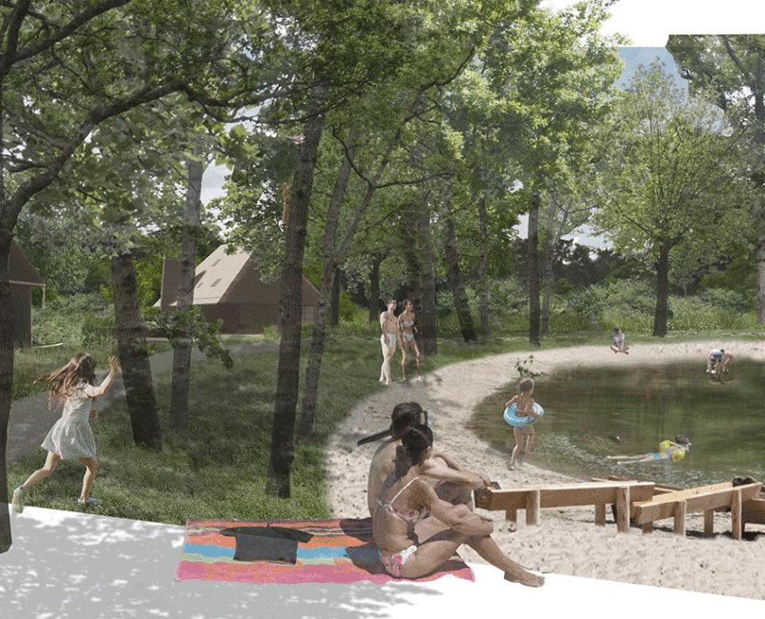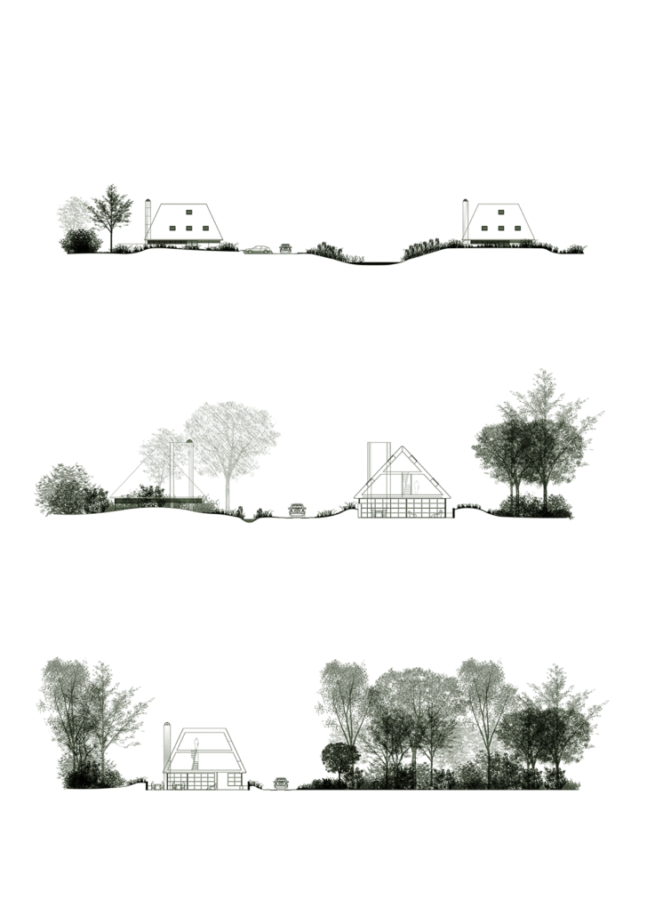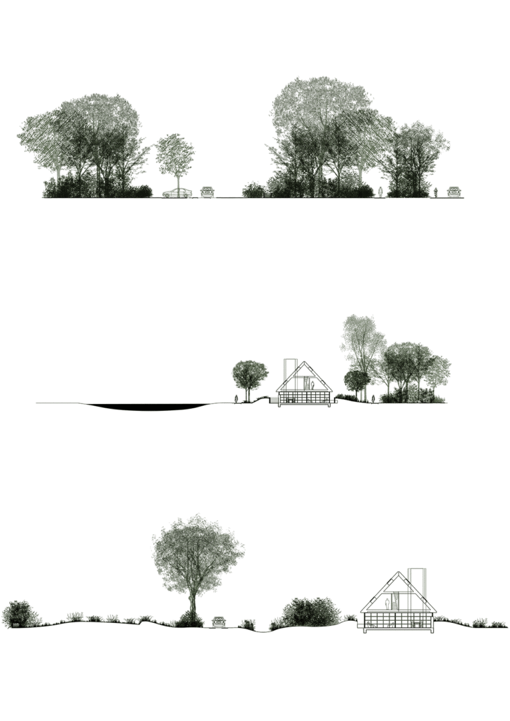 De voormalige tentvelden worden benut voor de aanleg van de interne wegen en de situering van de vakantievilla’s. Hierdoor blijft het grootste deel van de bestaande bomen en heesters behouden. Op twee plekken wordt de rand richting het Refugium licht gedund om een visuele verbinding tussen de gebieden te creëren. Nieuwe beplanting wordt afgestemd op het karakter van de binnenduinrandbossen en de grazige open delen worden ingezaaid met zaden afkomstig uit het Refugium.