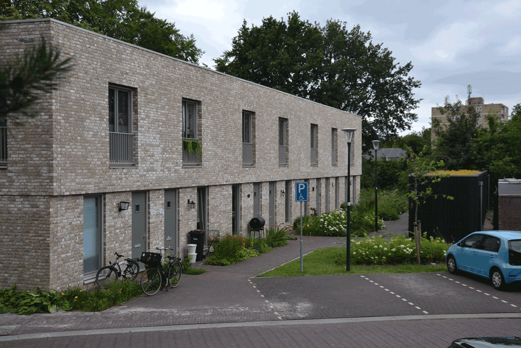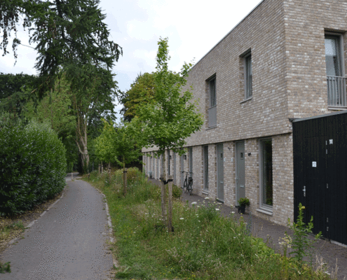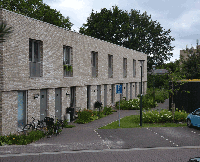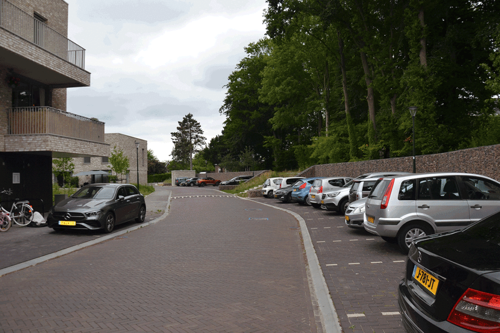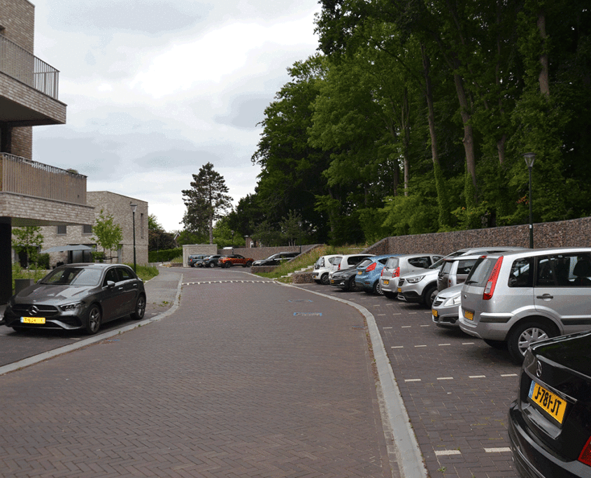 Aan de kopse zijden van de nieuwbouw komt de ontsluitingsstraat. Hier worden ook de parkeervakken aan gekoppeld. Het bestaande hoogteverschil wordt middels schanskorven gehandhaafd en zorgt ervoor dat de bestaande bomen kunnen blijven staan. Deze karaktervolle rand blijft in stand en wordt her en der aangevuld met nieuwe bomen en heester groepen. Om de hoeveelheid oppervlakte te minimaliseren worden de wegen versmald uitgevoerd maar de totale breedte verkregen door zones van 1 meter grasstenen aan beide zijden aan te brengen. Ook de parkeervakken worden met grasstenen uitgevoerd.