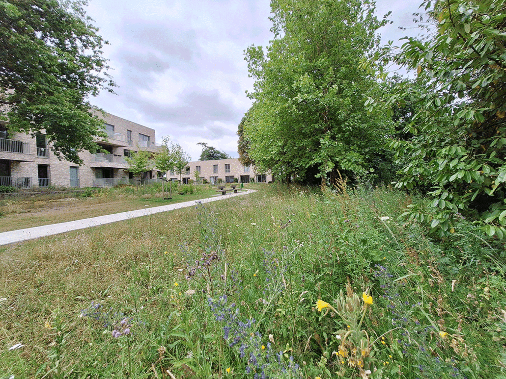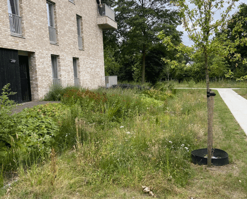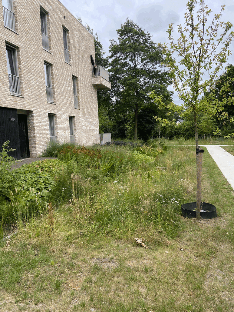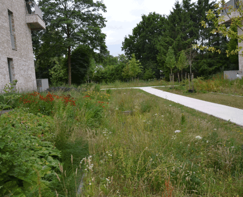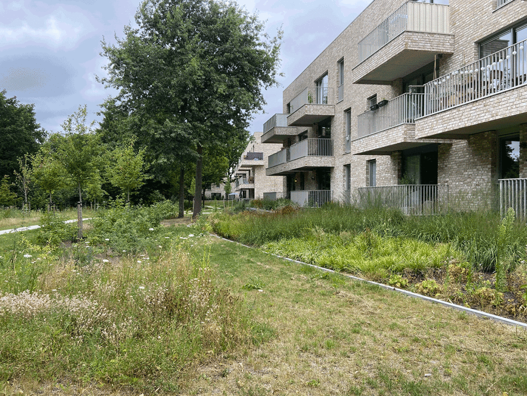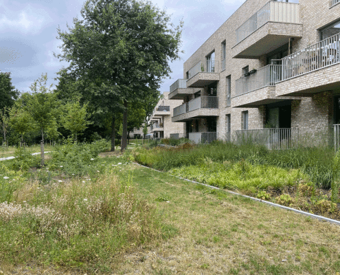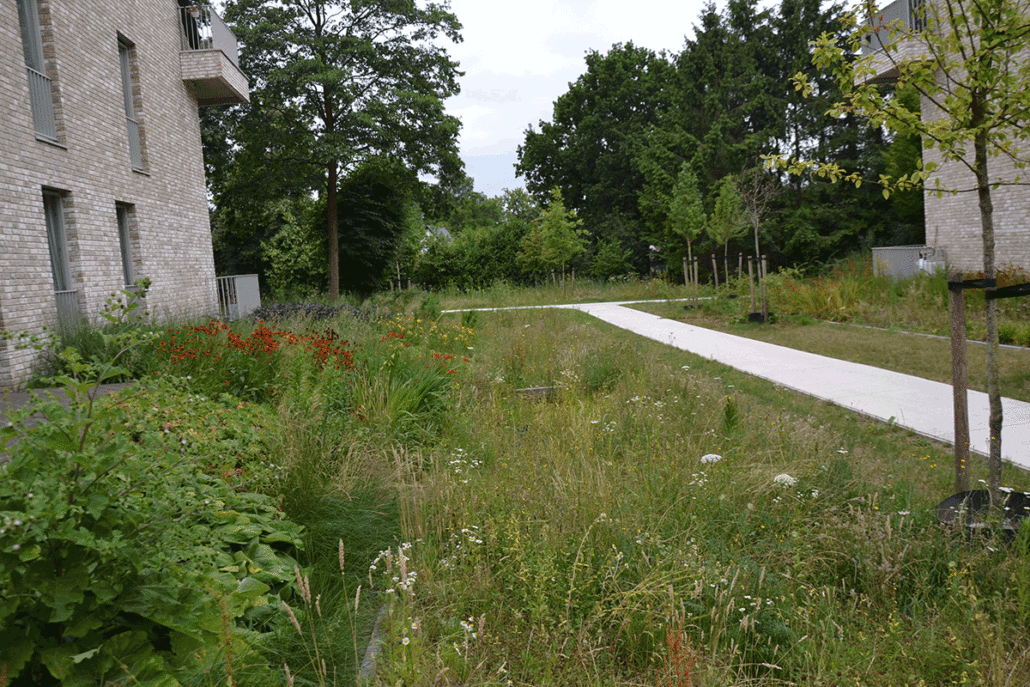Naast de bestaande greppels worden nieuwe greppels tussen de bouwblokken gegraven. Hier wordt al het regenwater naartoe afgevoerd. Het kan hier inzijgen en bij hevige regenval wordt het afgevoerd naar een groot infiltratie bassin in de noordoost hoek van het terrein.