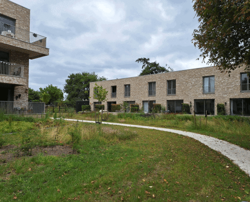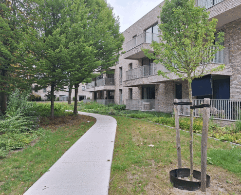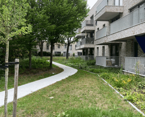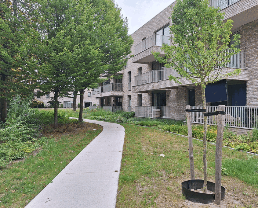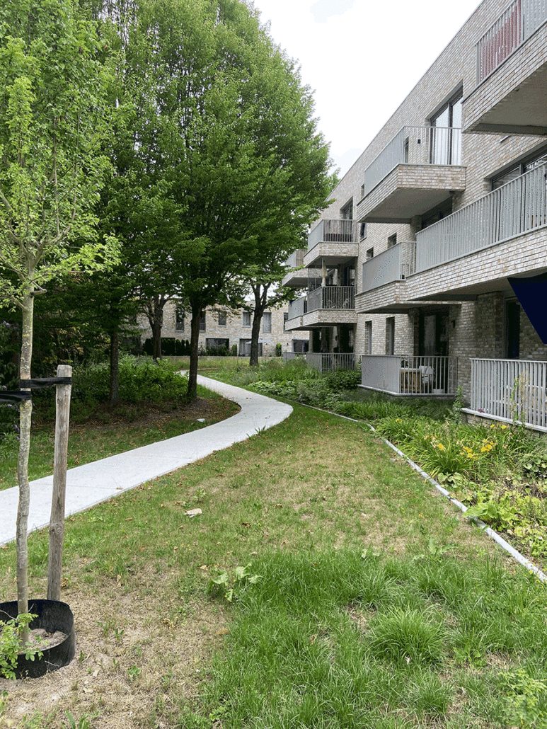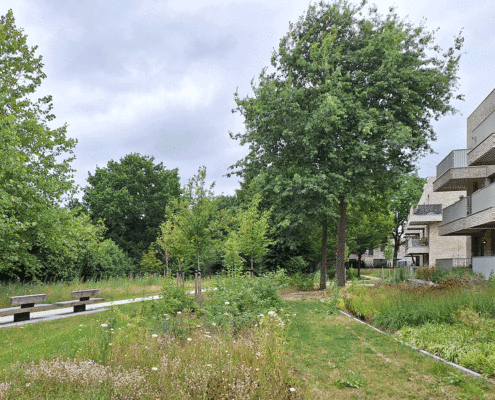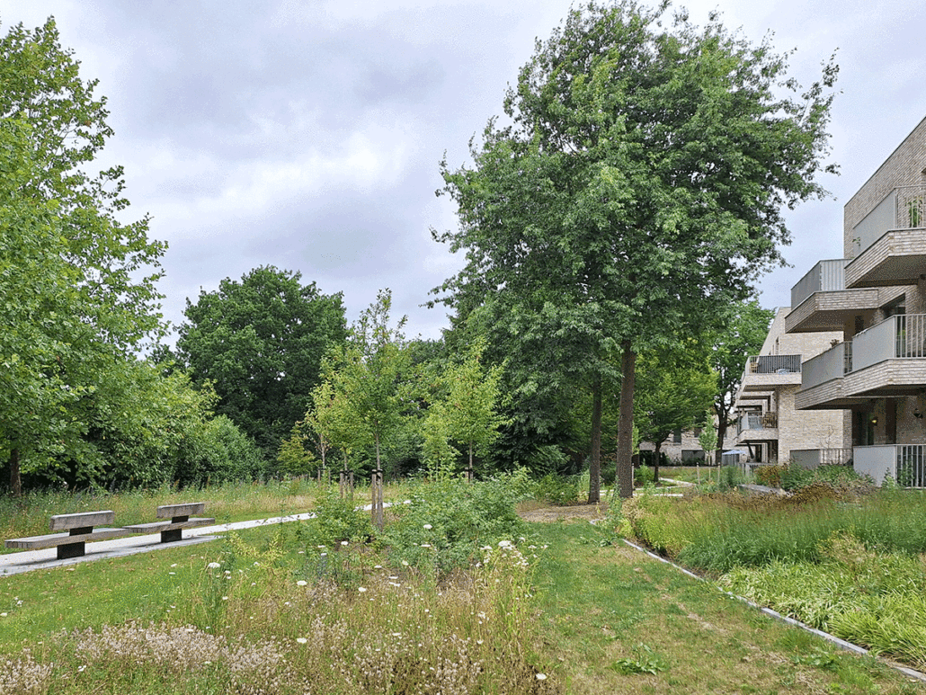 Naast de bestaande greppels worden nieuwe greppels tussen de bouwblokken gegraven. Hier wordt al het regenwater naartoe afgevoerd. Het kan hier inzijgen en bij hevige regenval wordt het afgevoerd naar een groot infiltratie bassin in de noordoost hoek van het terrein.