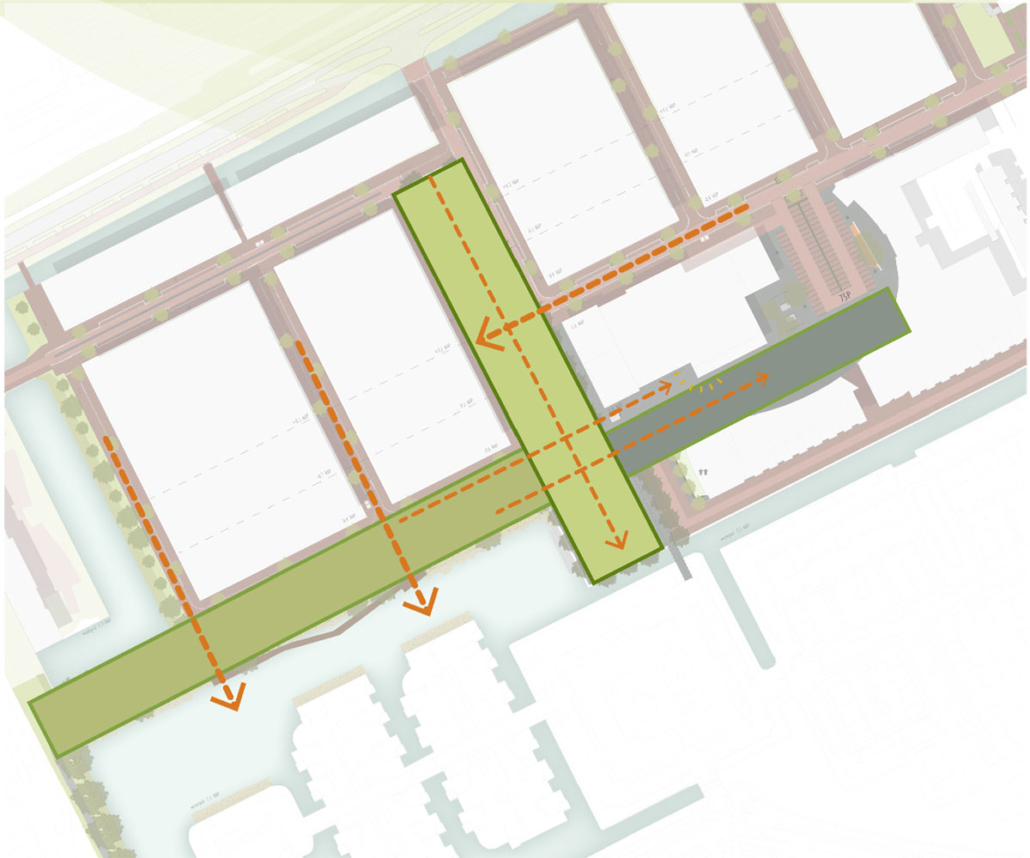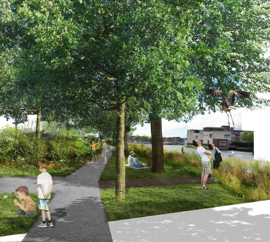 Deze twee onderdelen vormen de groene structuren van de wijk. De promenade is een voetgangersverbinding langs een bestaande watergang naar het winkelcentrum. De harde oevers van de watergang worden omgevormd tot natuurvriendelijke oevers en een deel van de bestaande bomen vormen samen met de rietoevers, de struikgroepen met een mantelzone van ruig gras vormen de basis van het ontwerp. Deze zone zal een hoge natuurwaarde krijgen en een grote bijdrage leveren aan de biodiversititeit van de wijk. Langs de wandelroute worden sport en spelaanleidingen geplaatst.