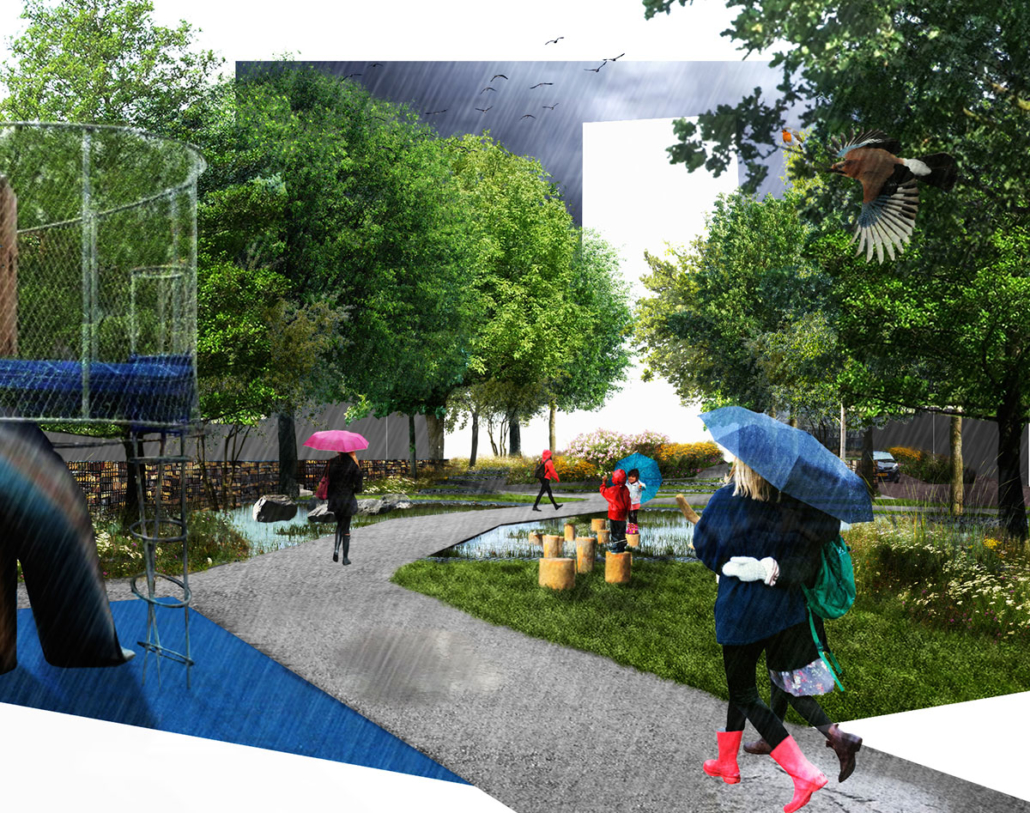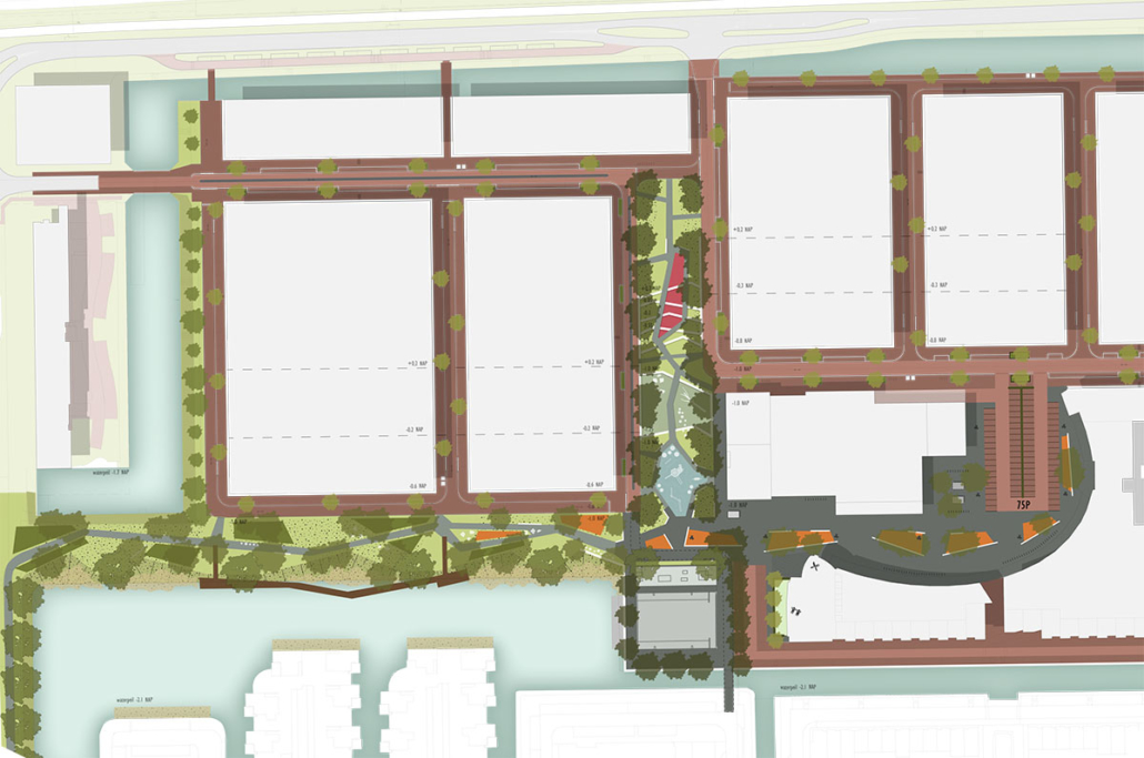 Het park ligt centraal in de wijk en bestaand uit een groen deel en een verhard deel. Het bestaande skatepark en voet/basketbalveld wordt in deze parkzone opgenomen. Een belangrijke functie van het park is het vertraagd afvoeren van het regenwater van een groot deel van de wijk en het oplossen van het hoogteverschil tussen de twee wijkdelen. Dit is in het ontwerp samengevoegd tot een getrapt park te ontwerp met meerder terrassen. Het laagste deel wordt de infiltratiezone en is voorzien van een natuurlijke speelplek.