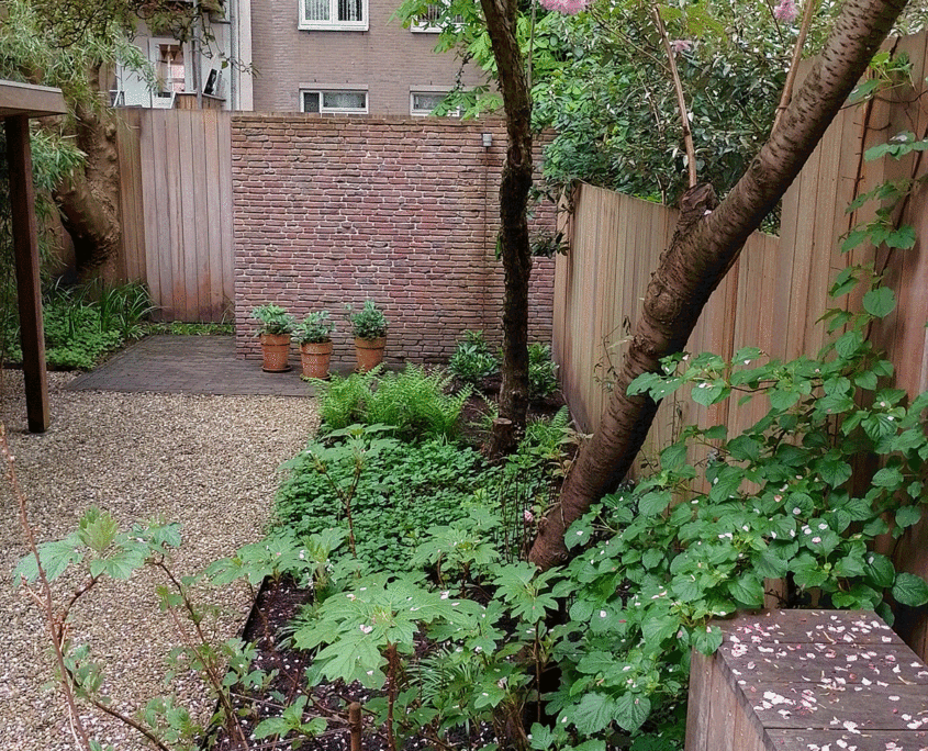 Deze tuin in de Pijp in Amsterdam heeft alle aspecten van een Amsterdamse binnentuin. Een door de aanwezigheid van bomen schaduwrijke situatie en verhoogde ligging van de woning ten opzichte van de tuin. Een oase van rust ten opzichte van de drukte van de nabij gelegen Albert Cuyp en de grote hoeveelheid aan terrassen in dit deel van de Pijp.